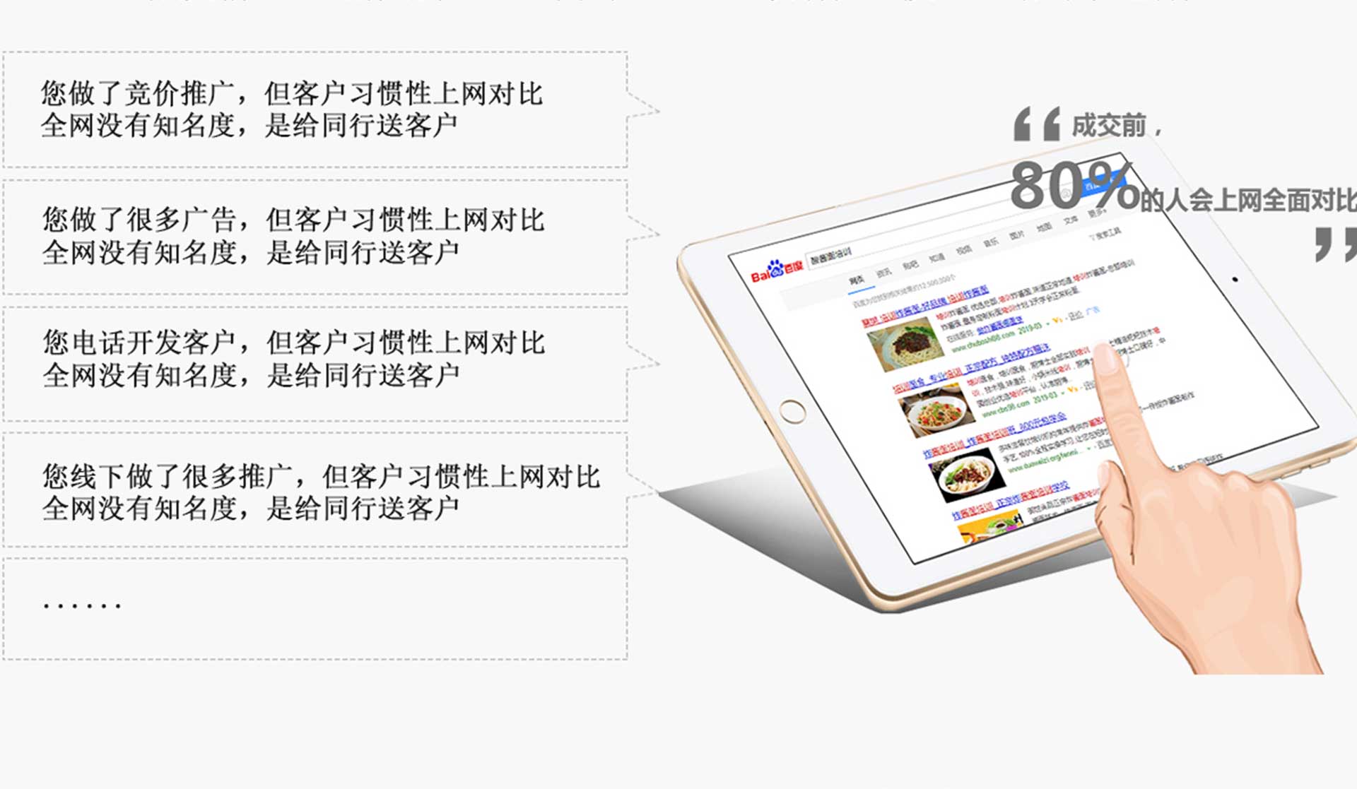 成交前80%的人會上網全面對比,全網沒有知名度,是給對手送客戶