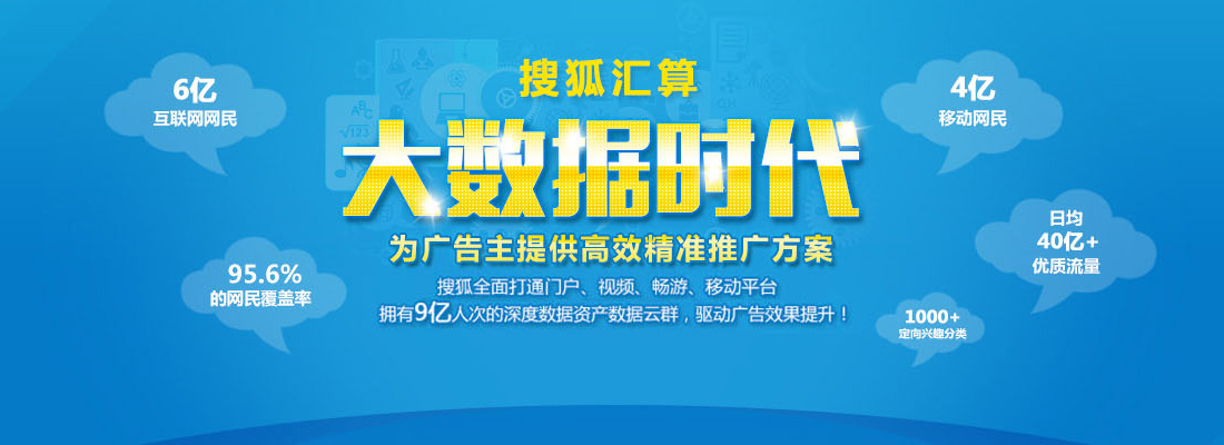 搜狐匯算擁有搜狐門戶、手機搜狐網、搜狐新聞客戶端、搜狐暢游、搜狐視頻等多渠道優質媒體資源,匯聚搜狐月度觸達95. 58%的網民數據,覆蓋廣泛的互聯網及移動互聯網人群。搜狐匯算進行多種創意表現形式的網絡廣告投放,綜合適用人群定向、創意輪播、地域定向等優化技術,為客戶提供精準服務。